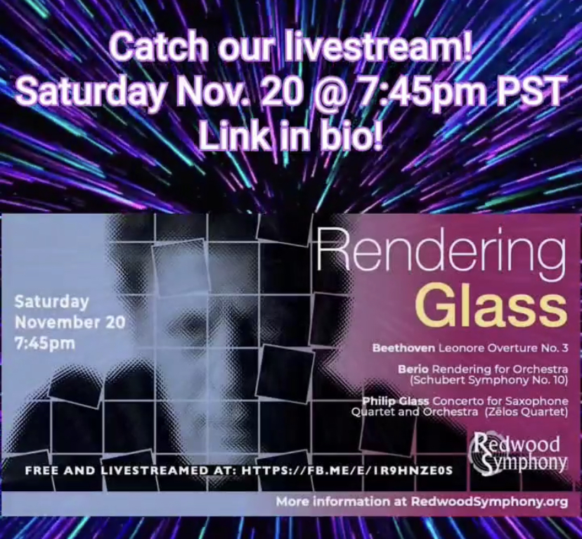 November 20, 2021 – “Rendering Glass”: Zēlos performs Philip Glass Saxophone Quartet Concerto with the Redwood Symphony Orchestra | Redwood City, CA (Saturday, time TBD)